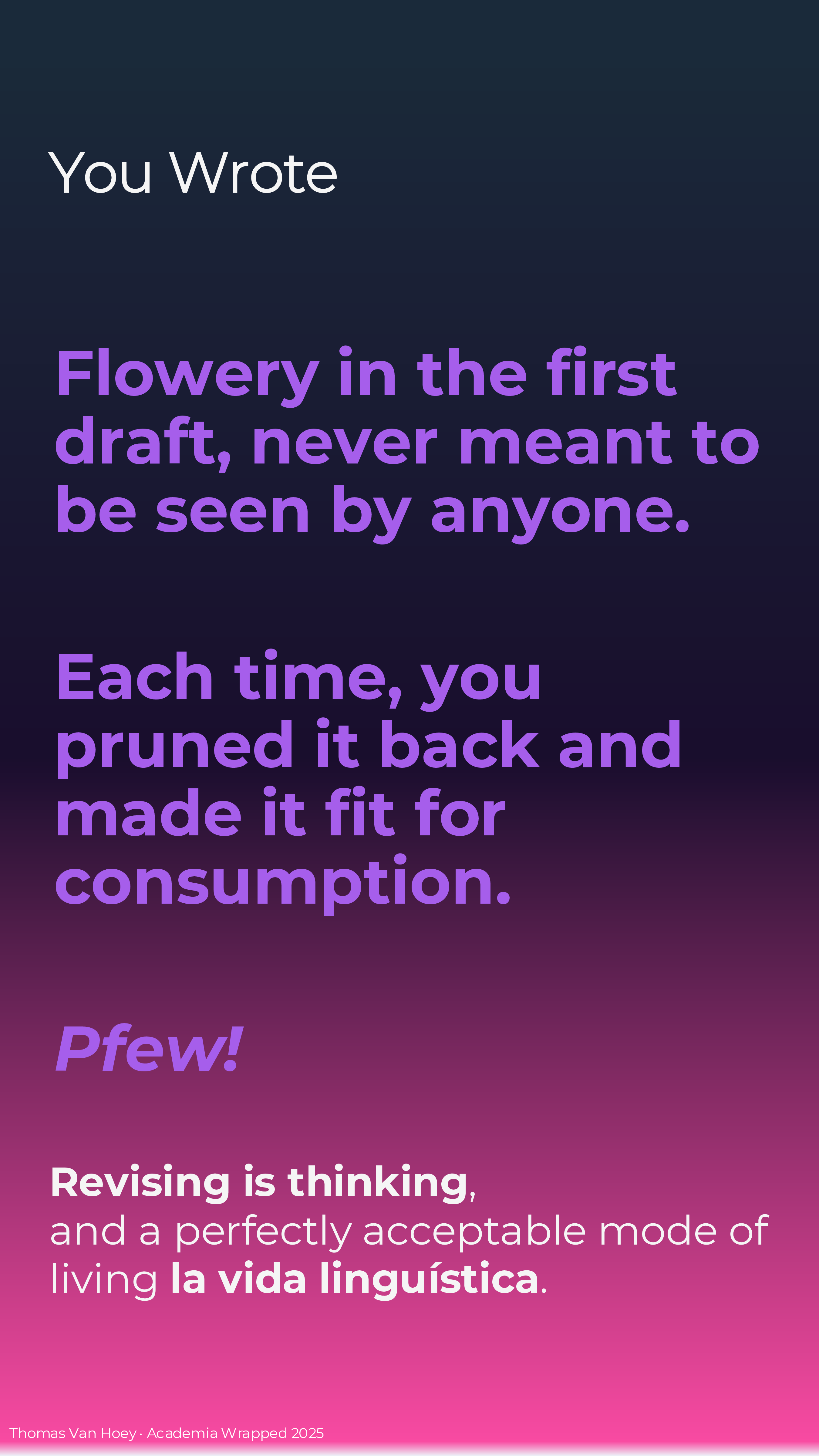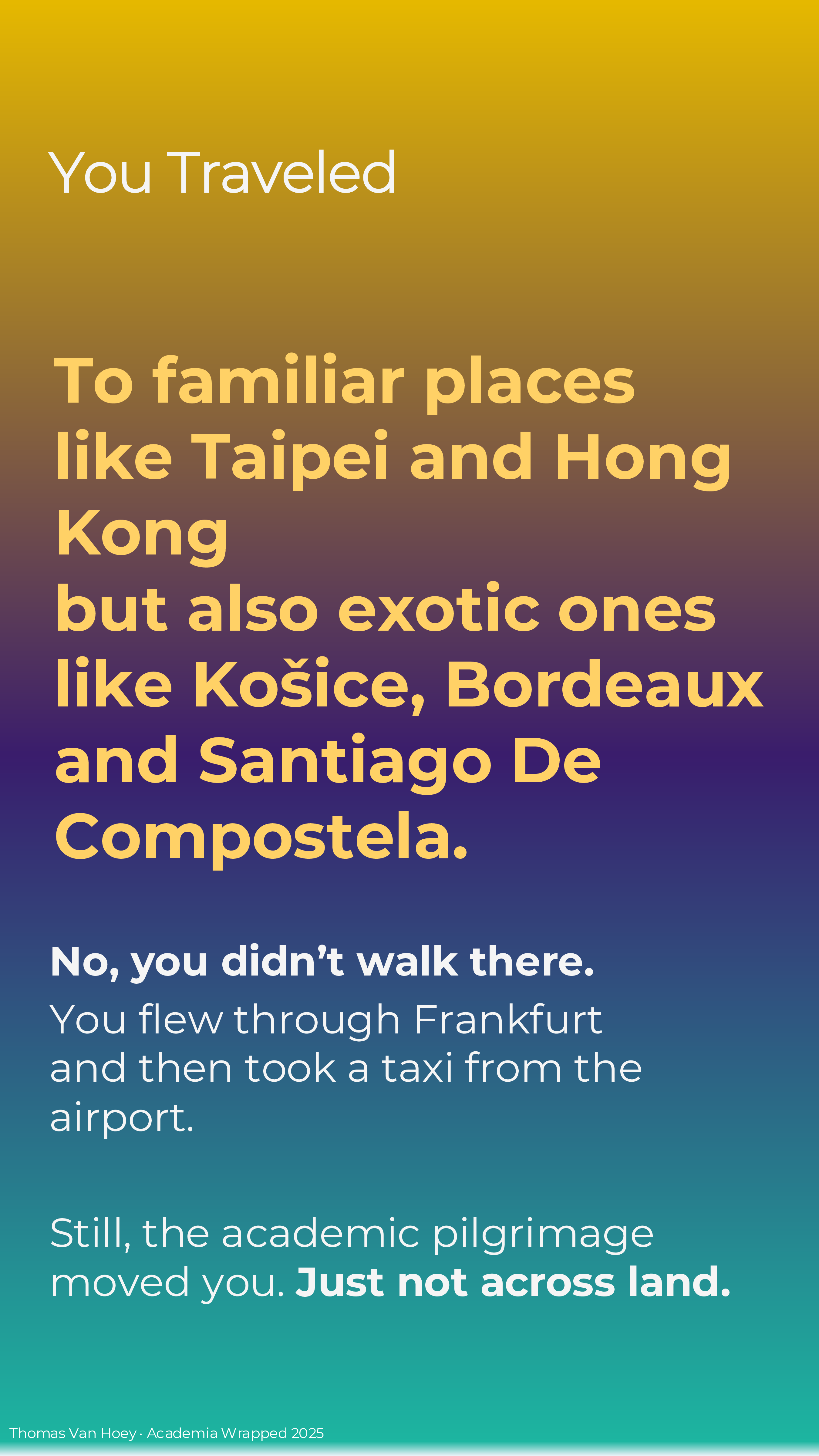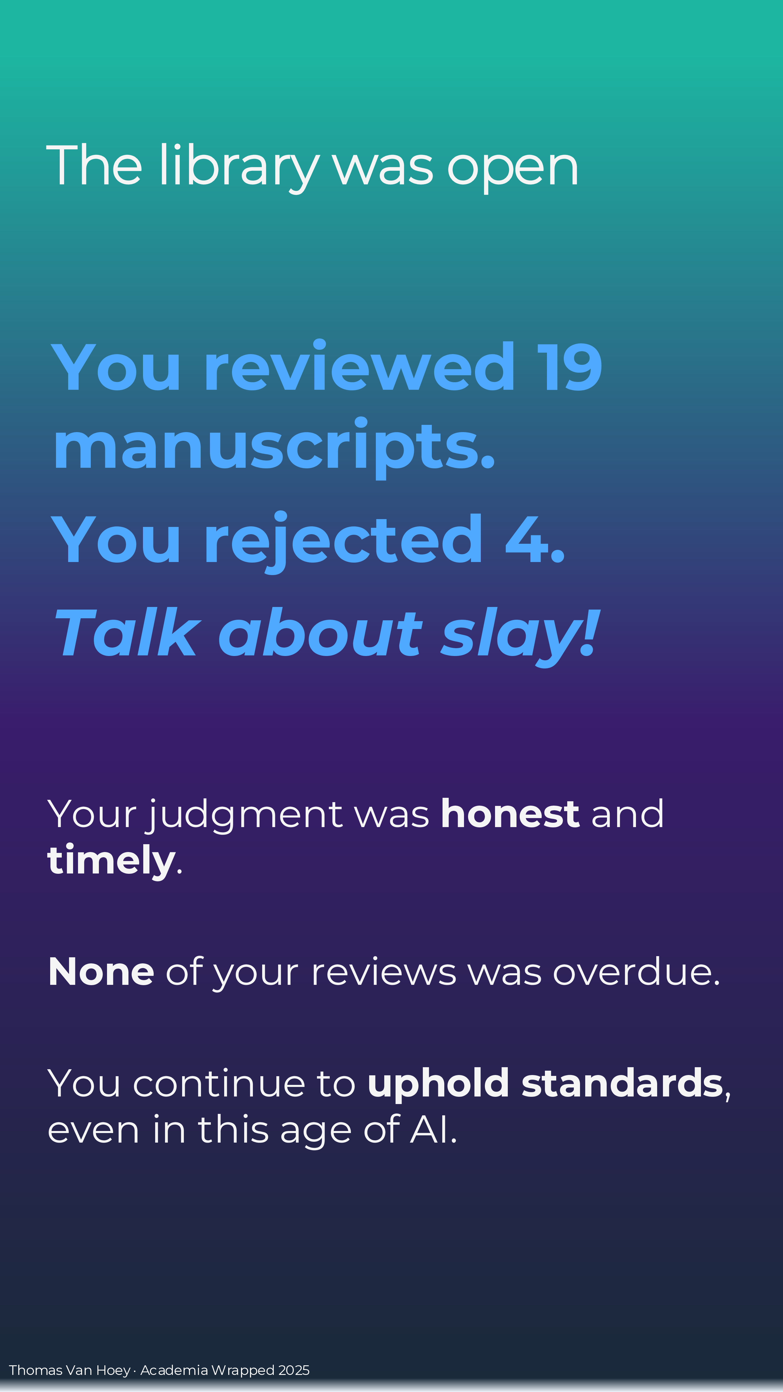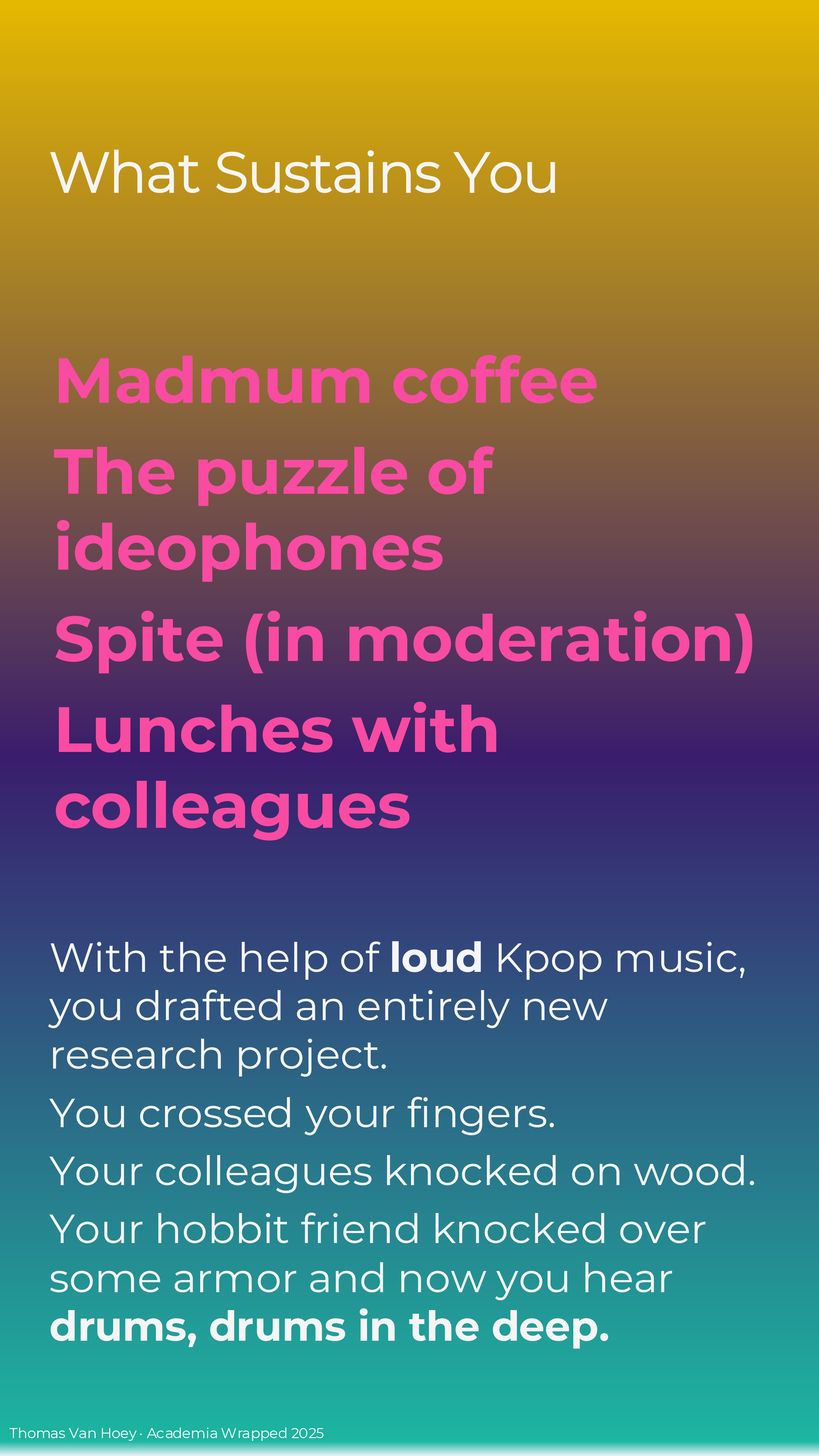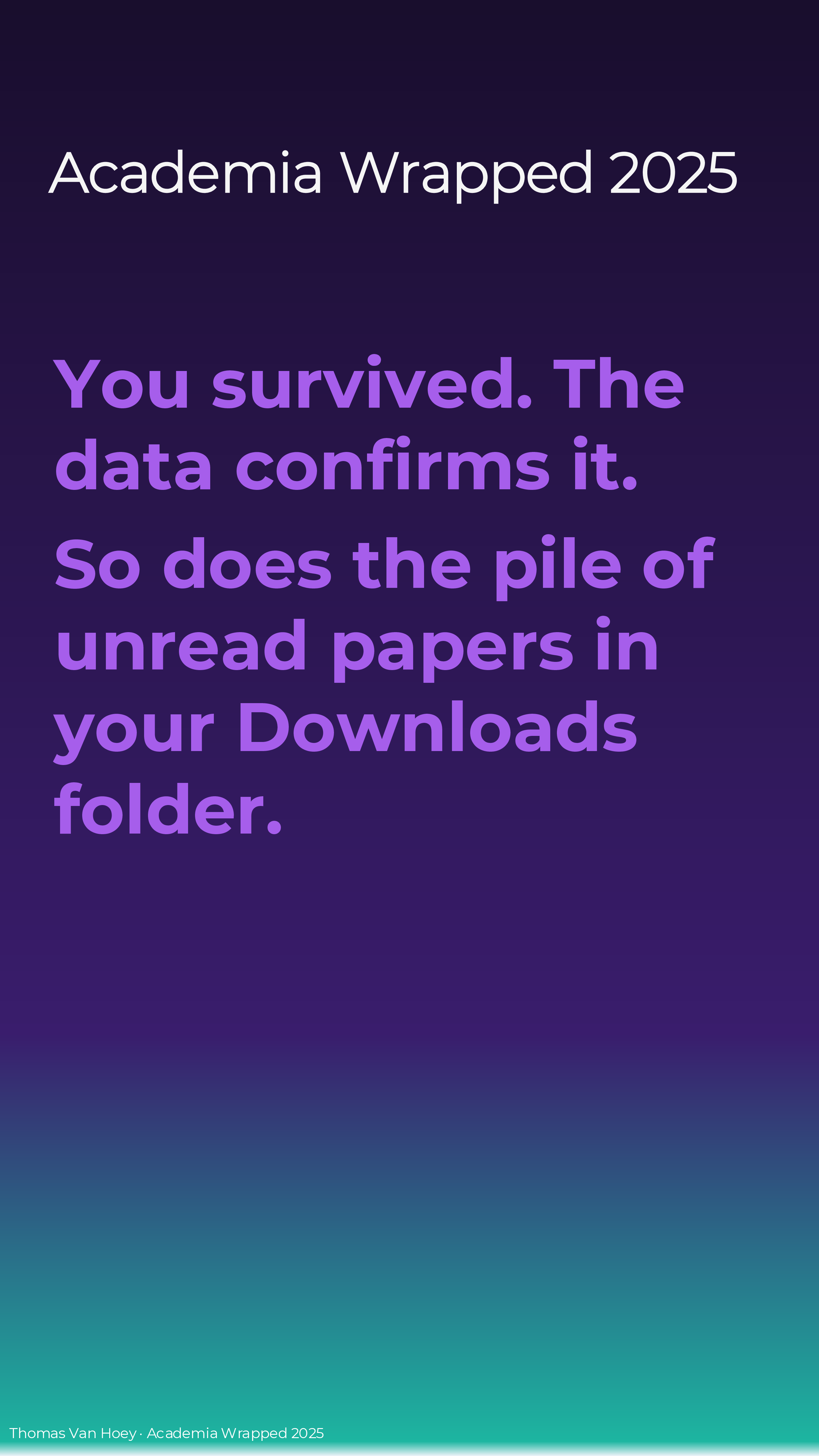 If you too make your own Academia Wrapped 2025 (or if you’re reading this later), I just made it in MS Powerpoint. Contact me if you want the slides, but I want to see your wrapped in return! But please, do not contact me with some AI-generated emoji-ridden Linked-in “summary”. We’re all adults: we can spend the effort to make a good product or leave in the realm of possibilities. In the words of the Korean philosophers ENHYPHEN: