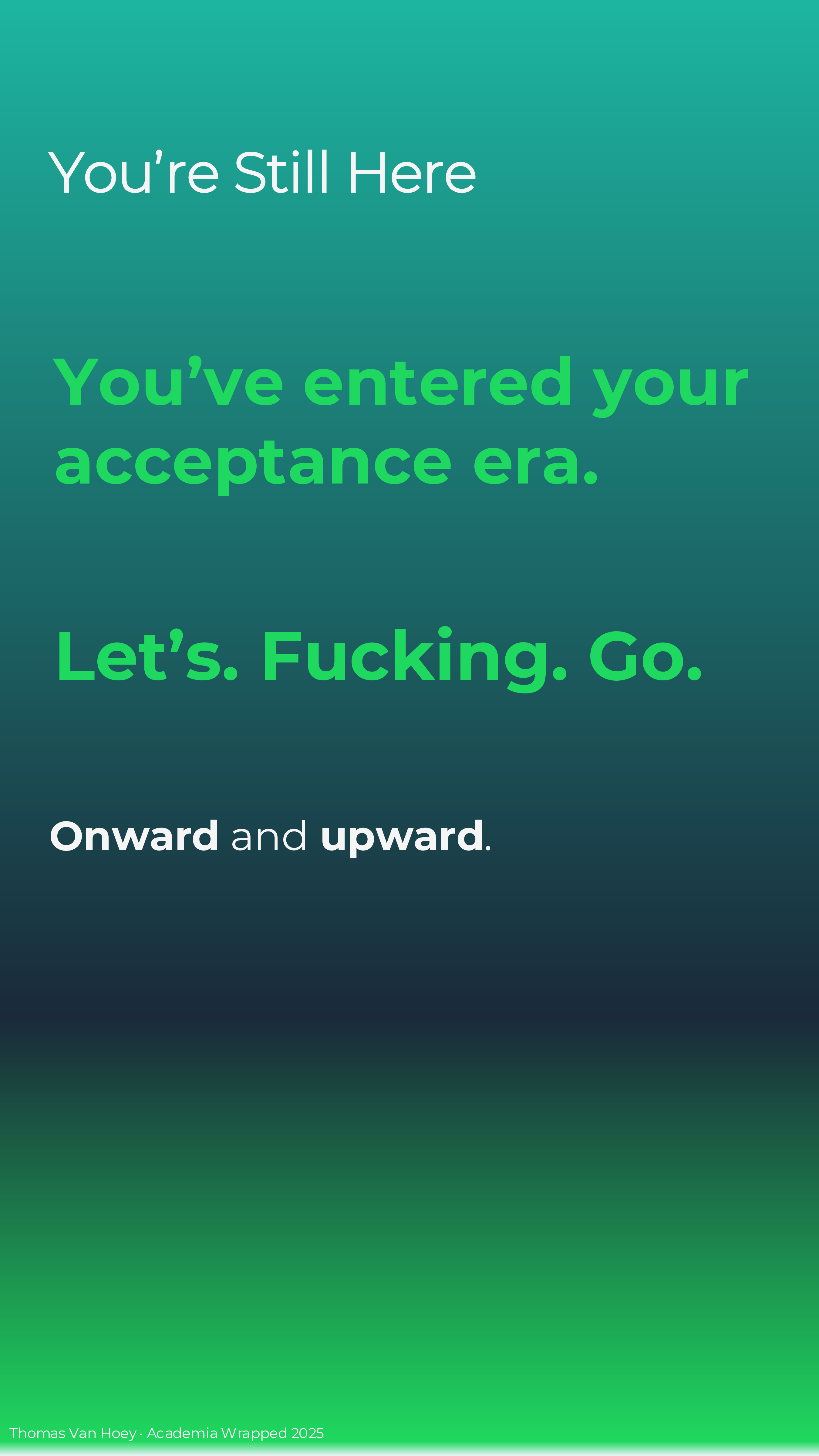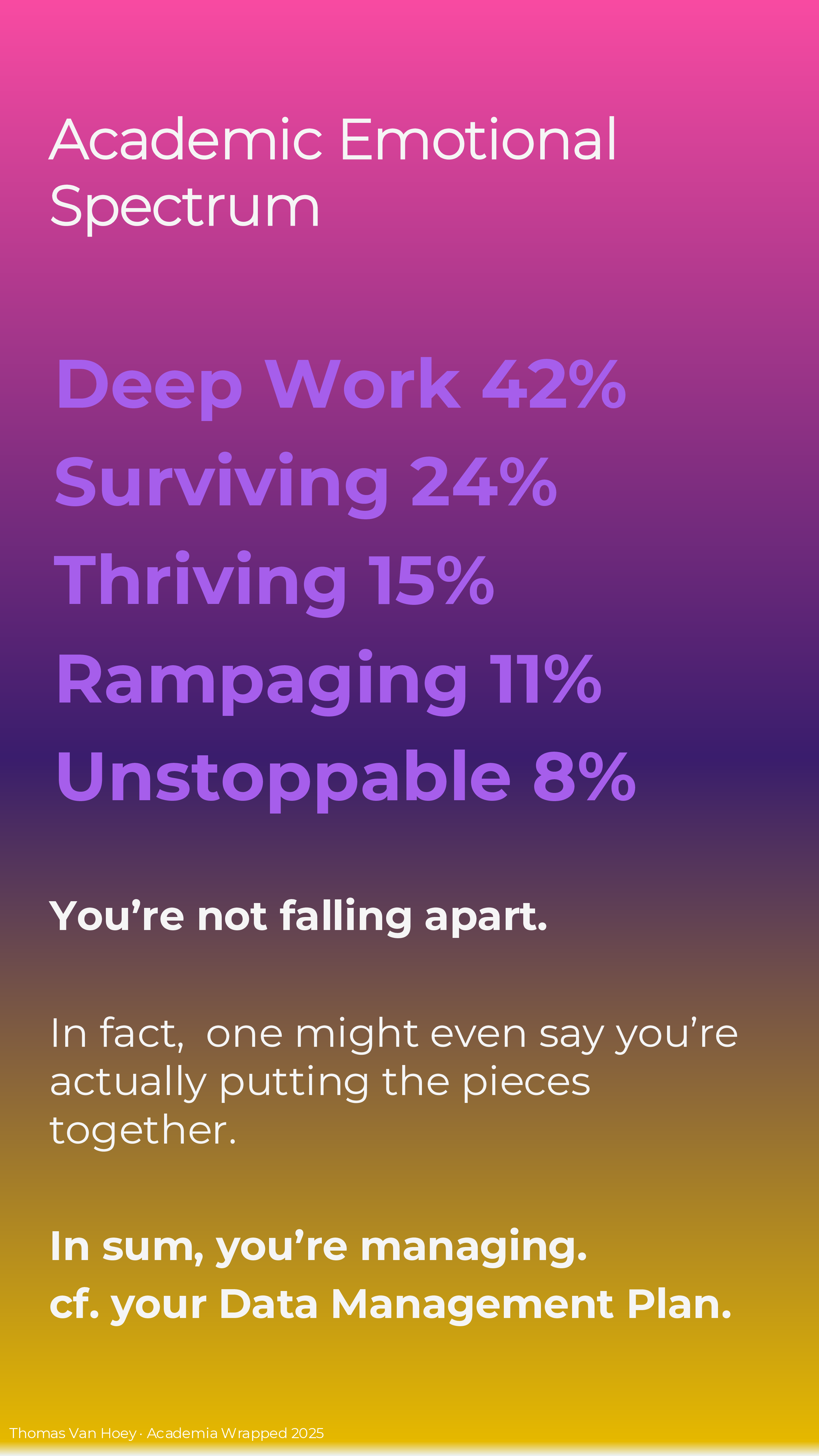 If you too make your own Academia Wrapped 2025 (or if you’re reading this later), I just made it in MS Powerpoint. Contact me if you want the slides, but I want to see your wrapped in return! But please, do not contact me with some AI-generated emoji-ridden Linked-in “summary”. We’re all adults: we can spend the effort to make a good product or leave in the realm of possibilities. In the words of the Korean philosophers ENHYPHEN: